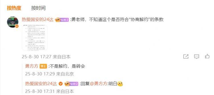 有网友提到了“协商解约”的条款,@勇方方 回复:“不是解约,是转会。”